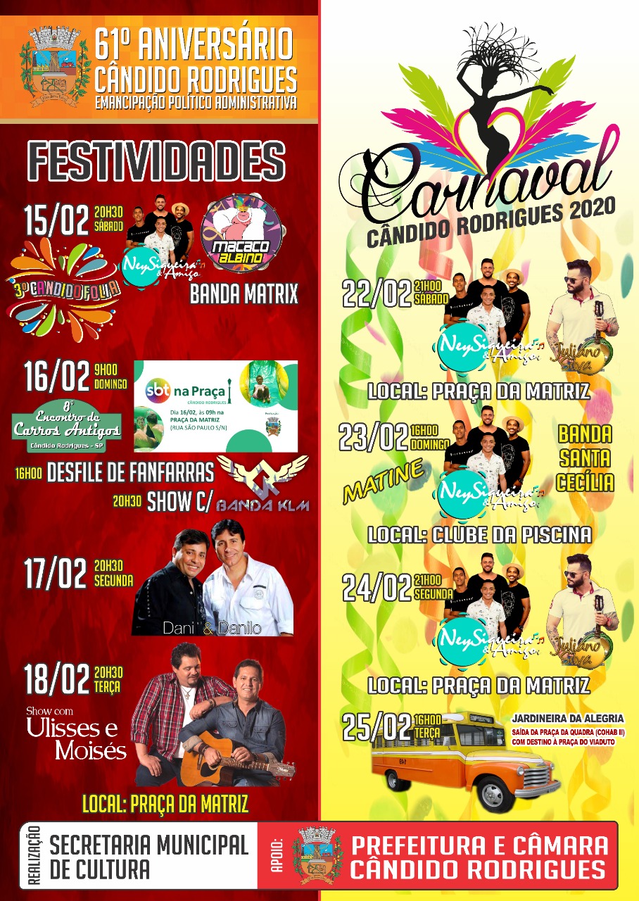 No próximo dia 18/02 o município de Cândido Rodrigues completa 61 anos de emancipação político administrativa. Para lembrar a data a Prefeitura Municipal, através da Secretaria Municipal de Cultura, programou uma série de atividades que terão início no sábado que antecede o aniversário, 15/02.