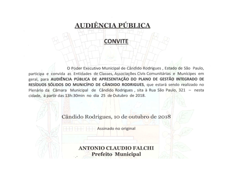 Comunicado - Audiência Pública Plano de Gestão Integrada dos Resíduos Sólidos do Município de Cândido Rodrigues.