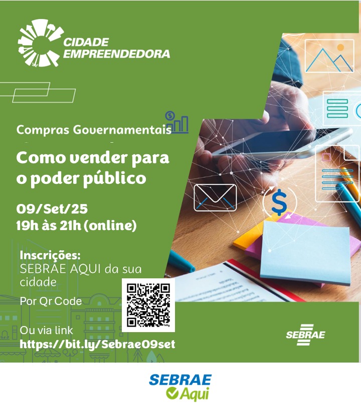 A Prefeitura de Cândido Rodrigues, em parceria com o SEBRAE, convida os empreendedores locais para participarem do evento online “Cidade Empreendedora – Compras Governamentais”, que será realizado no dia 9 de setembro de 2025, das 19h às 21h.