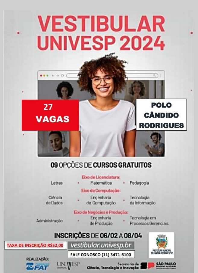 Inscrições para o Processo Seletivo de 06/02 a partir das 15h até as 21h do dia 08/04/2024. https://univesp.fatvestibulares.com.br/home/
